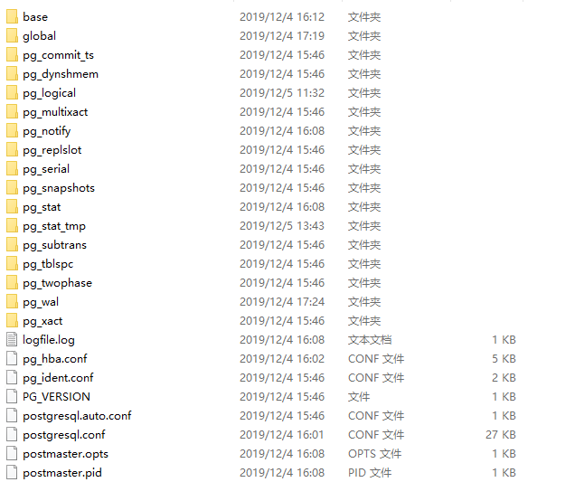initdb -D ../data -U postgres,在data目录下初始化一个实例,使用的用户名为“postgres”,这里并没有设置密码。 - 初始化后,data目录结构为: