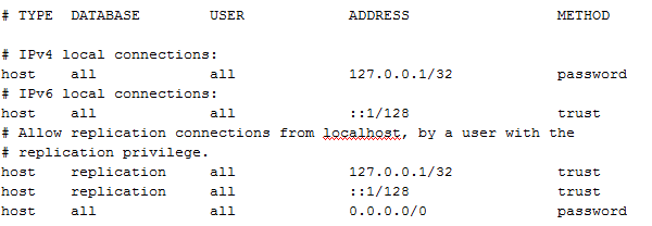 pg_hba.conf禁止无密码登录。 - 针对不同的访问条目,修改