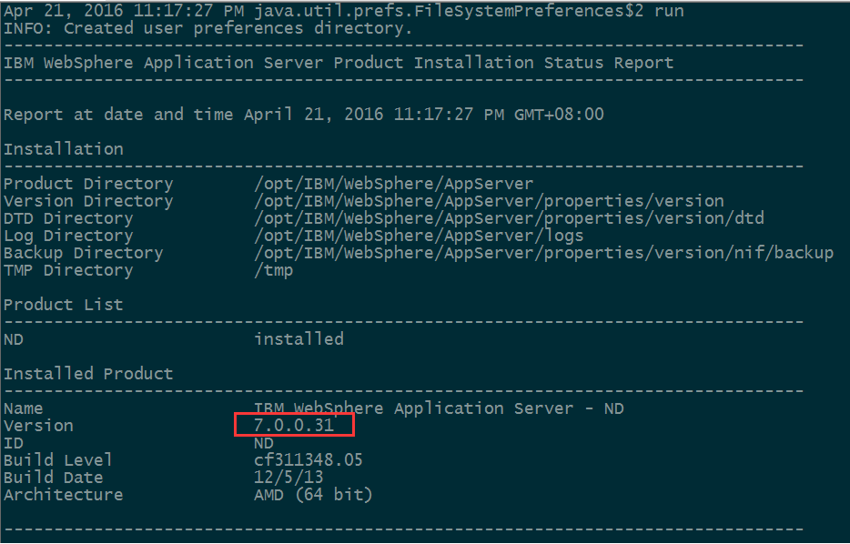 i. 执行/opt/IBM/WebSphere/AppServer/bin下执行./versionInfo.sh查看当前版本号